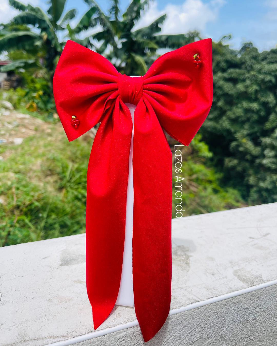 Lazo coquette con clip bordado con piedras simulando fresas 🪡